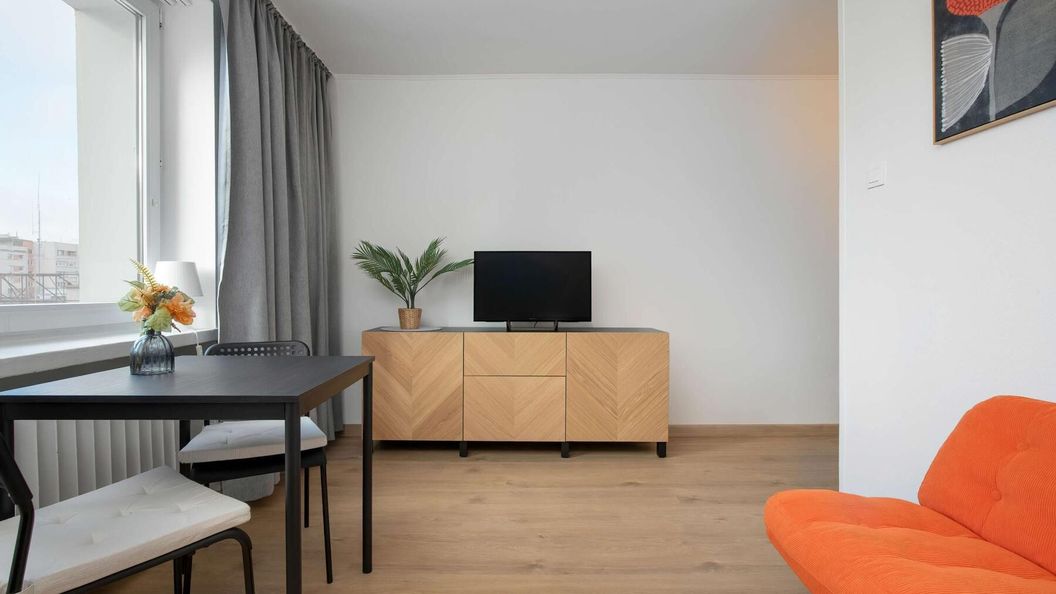 W przestrzeni przygotowanej dla dwóch osób stworzono warunki sprzyjające spokojnemu wypoczynkowi oraz swobodnemu korzystaniu z pełnego wyposażenia. Jasny salon połączony z częścią sypialnianą pozwala wygodnie zrelaksować się po dniu spędzonym w mieście, a rozkładana sofa zapewnia przytulne miejsce noclegowe. Obok znajduje się w pełni wyposażona kuchnia, dzięki której można bez pośpiechu przygotować posiłki i cieszyć się nimi przy stole jadalnianym.