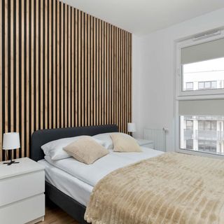 Łóżko dwuosobowe, komplet pościeli, biurko z krzesłem, szafki, szafa, stojąca suszarka do ubrań, odkurzacz, żelazko, deska do prasowania