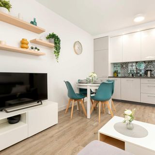 Sercem apartamentu jest przestronny salon połączony z aneksem kuchennym. Znajdziesz tu wygodną, rozkładaną sofę narożną, która wieczorami zamienia się w komfortowe miejsce do spania dla dwóch osób. Naprzeciwko niej umieszczono telewizor z funkcją Smart TV – to idealna okazja, by po dniu pełnym zwiedzania zrelaksować się przy ulubionym serialu, korzystając z szybkiego Wi-Fi. Z salonu prowadzi wyjście na prywatny balkon. Wyposażony w meble ogrodowe, staje się on wymarzonym miejscem na poranną kawę w promieniach słońca lub wieczorną lampkę wina na świeżym powietrzu.