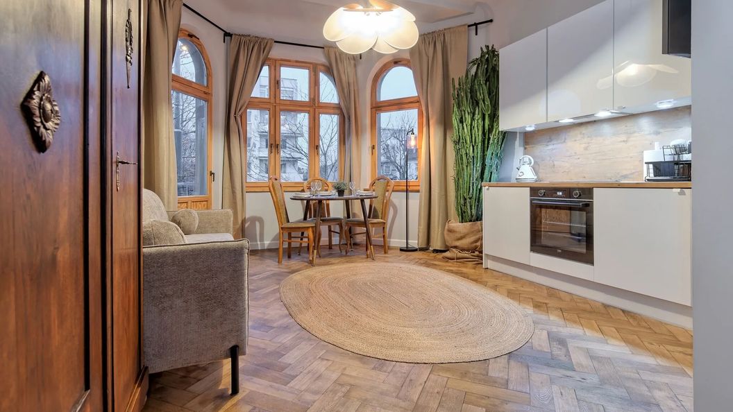 Przestrzeń o powierzchni 25 m² obejmuje pokój dzienny z rozkładaną sofą, w pełni wyposażony aneks kuchenny oraz łazienkę z prysznicem. Do dyspozycji gości jest zmywarka, piekarnik, płyta grzejna, lodówka, czajnik elektryczny i niezbędne przybory kuchenne. Uzupełnieniem jest niewielki balkon od strony ulicy, z którego roztacza się widok na miasto.