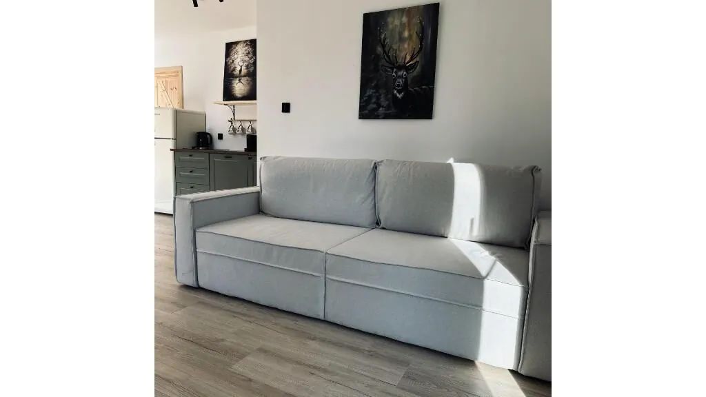 Wyposażenie: przestronny salon (40 m²) z rozkładaną sofą, aneks kuchenny ze zmywarką, ekspresem do kawy i pełnym sprzętem do gotowania, duża łazienka z prysznicem, na piętrze sypialnia z łóżkiem małżeńskim oraz toaleta.