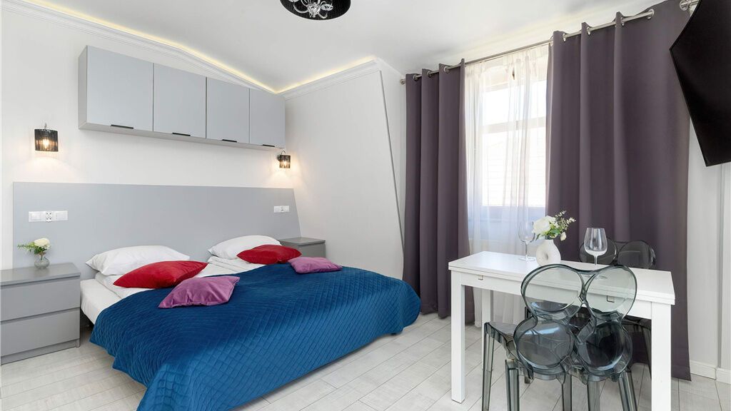 Wnętrze apartamentu zachwyca jasnością, nowoczesnością i starannie dobranymi detalami, które tworzą harmonijną i przytulną przestrzeń. Elegancka aranżacja w stonowanych kolorach przełamana została akcentami ożywiającymi wnętrze, a duże okna wpuszczają mnóstwo naturalnego światła, podkreślając przestronność apartamentu. Część wypoczynkowa oferuje 2 pojedyncze łóżka zapewniające idealne warunki do wypoczynku. Obok znajduje się praktyczny stół z krzesłami, tworząc przytulne miejsce na wspólne posiłki lub poranną kawę. Do dyspozycji Gości pozostaje telewizor z telewizją kablową oraz funkcją Smart TV, co sprzyja relaksowi po całym dniu. Z salonu prowadzi wyjście na uroczy balkon, na którym można cieszyć się świeżym powietrzem i chwilą spokoju. Aneks kuchenny został wyposażony w nowoczesną płytę indukcyjną, piekarnik, zmywarkę, ekspres do kawy, lodówkę z zamrażarką, czajnik elektryczny oraz kuchenkę mikrofalową. Przestrzeń uzupełnia starannie dobrana zastawa stołowa, umożliwiająca wygodne przygotowywanie i spożywanie posiłków w domowym klimacie. Łazienka zachwyca eleganckim, nowoczesnym wykończeniem w jasnych tonacjach, zapewniając jednocześnie pełen komfort użytkowania. Do dyspozycji znajduje się przestronna kabina prysznicowa, stylowa umywalka z dużym lustrem oraz toaleta, a całość dopełniają praktyczne dodatki podnoszące wygodę codziennego użytkowania.