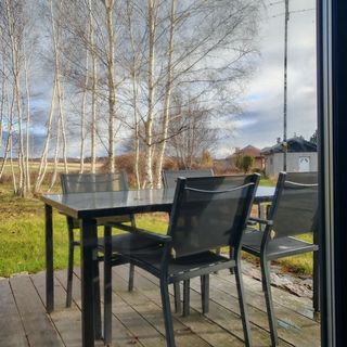 Do domku przynależy prywatny, słoneczny taras z meblami ogrodowymi i sprzętem do grillowania, idealny do spędzania czasu na świeżym powietrzu. Bezpośrednio przy obiekcie znajduje się miejsce parkingowe. Teren wokół jest otwarty, z widokiem na okoliczne pola i pasiekę, co podkreśla kameralny charakter miejsca.