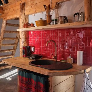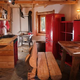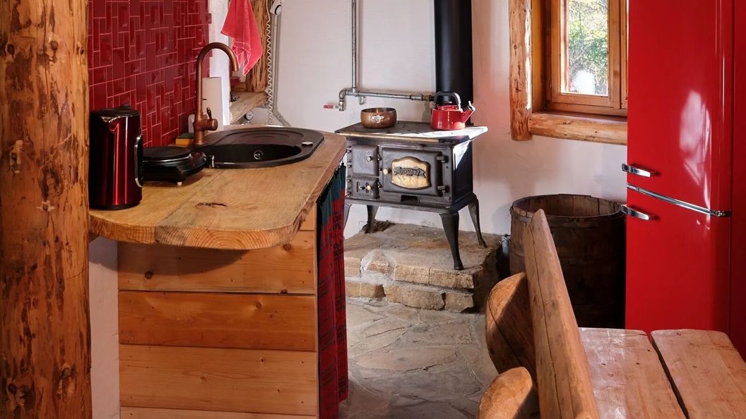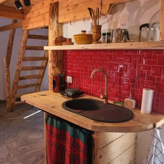 W domku znajduje się aneks kuchenny z płytą grzejną, lodówką, czajnikiem i akcesoriami kuchennymi. Oprócz standardowego wyposażenia, goście mogą korzystać z tradycyjnej kuchni opalanej drewnem.