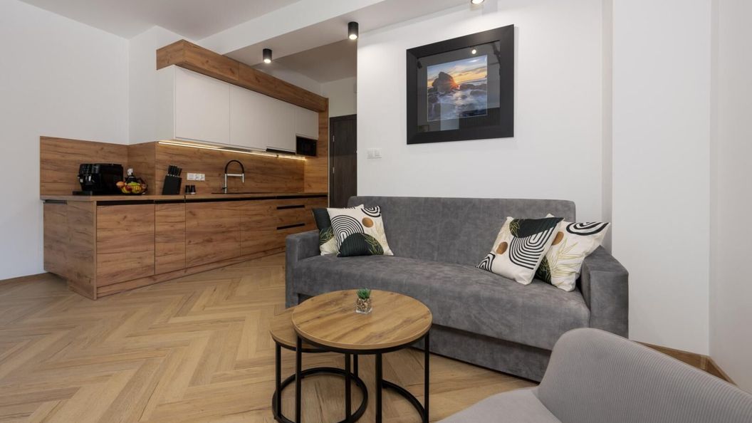 Wyposażony w jedno szerokie łóżko małżeńskie oraz rozkładaną dwuosobową kanapę w salonie, stolik kawowy, stół z 4 krzesłami, pojemną szafę oraz dwa telewizory z płaskim ekranem w systemie smart TV, jednym w salonie i drugim w sypialni.