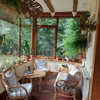 Dom otoczony jest dużą, naturalną przestrzenią z ogrodem ziołowym i małym oczkiem wodnym. Goście mogą korzystać z dużego tarasu od strony wschodniej oraz przeszklonej oranżerii od południowego zachodu. Na terenie posesji przygotowano również ławki wypoczynkowe oraz specjalną suszarnię, która może służyć do suszenia drewna lub zebranych w lesie grzybów.