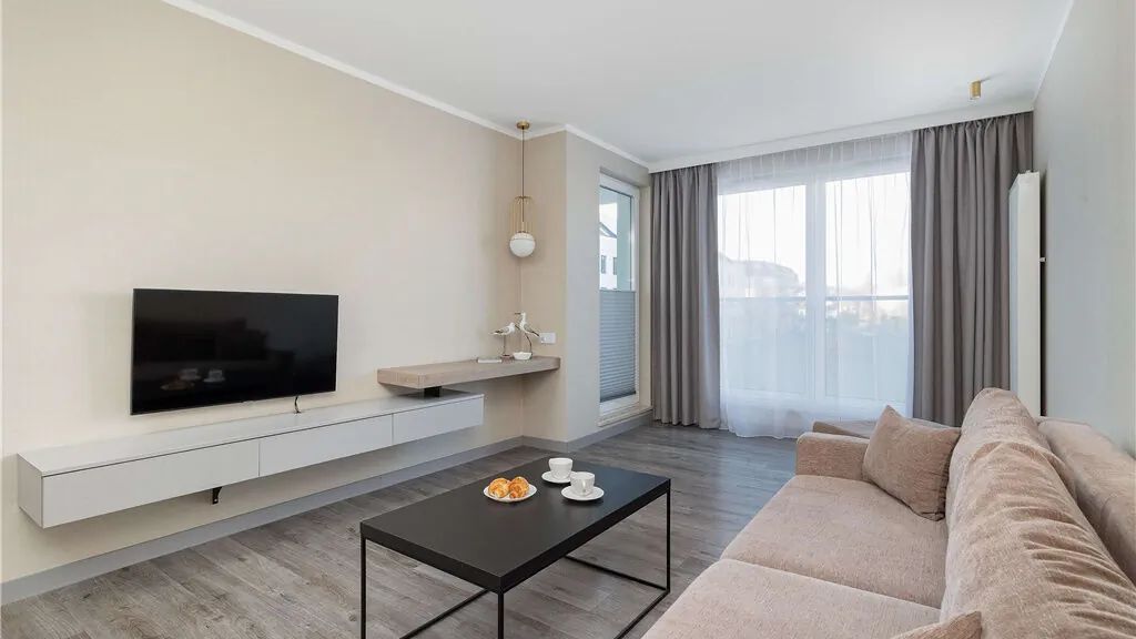 Sercem apartamentu jest przestronny salon połączony z aneksem kuchennym. Znajduje się tu wygodna, podwójna sofa, która w ciągu dnia zachęca do relaksu, a wieczorem zamienia się w dodatkowe miejsce do spania. Goście mogą korzystać z telewizora z dostępem do kanałów satelitarnych, co umili wieczory po dniu pełnym wrażeń. Z salonu prowadzi wyjście na umeblowany balkon – to wymarzone miejsce na delektowanie się aromatyczną, poranną kawą. Aneks kuchenny został w pełni wyposażony w wysokiej klasy sprzęt AGD. Do dyspozycji gości jest płyta indukcyjna, kuchenka mikrofalowa, toster oraz zmywarka, która wyręczy w codziennych obowiązkach. Miłośnicy kawy z pewnością docenią obecność ekspresu przelewowego.