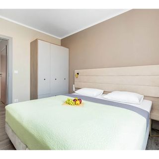 W sypialni czeka na Państwa szerokie łoże małżeńskie (180 cm), gwarantujące głęboki i spokojny sen, a pojemna szafa bez trudu pomieści wakacyjną garderobę. Łazienka z prysznicem, utrzymana w nowoczesnej estetyce, wyposażona jest w suszarkę do włosów. Wystrój wnętrza bazuje na jasnych barwach i drewnianych akcentach, co sprawia, że apartament jest niezwykle przytulny. Dla wygody zmotoryzowanych gości zapewniono bezpłatne, prywatne miejsce postojowe w hali garażowej. Rodziny z dziećmi mogą liczyć na udogodnienia w postaci łóżeczka i krzesełka. Dodatkowo, na terenie obiektu goście mogą skorzystać (za opłatą) z infrastruktury rekreacyjnej, w tym Aquaparku i strefy SPA.