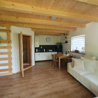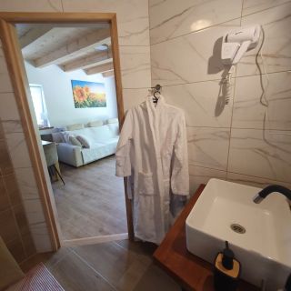 Do dyspozycji gości jest 3-osobowy apartament usytuowany na piętrze, z którego roztacza się widok na ogród. Posiada on niezależne wejście oraz prywatny taras.