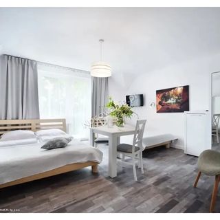 Pierwsze zdjęcia z galerii to apartament (mieszkanie), którego są Państwo właścicielami w ilości 1 (słownie jeden). Dlatego kiedy nie wynajmujesz apartamentu zwróć uwagę na zdjęcia mniejszego domu z pokojami. W jednym z takich pokoi mieliśmy okazję przebywać. Pokój trzy osobowy, który miał podwójne łóżko i fotel rozkładany. Fotel, który po rozłożeniu blokuje cały pokoik. Zdjęcia łazienki w ofercie daleko odbiegają od rzeczywistości. Zamiast kabiny jest za krótka zasłonka. Na uwagę zasługuje bezczelność i brak elastyczności Wynajmujących. \"Ciepła atmosfera\" jest tylko w razie braku zwracanych uwag. Zdjęcia pokoiku i łazienki poniżej: (...) Pokoik kosztował 180 pln za dobę.