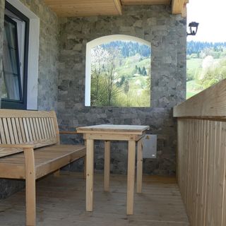 Zewnętrze: Każdy domek posiada własny taras z widokiem na góry, gdzie można delektować się poranną kawą.