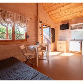 Domki mniejszePowierzchnia domku to 25 m2. Każdy domek posiada jedną sypialnię, salon, aneks kuchenny i łazienkę. Przed każdym domkiem znajduje się duży zadaszony taras, wyposażony w komplet wygodnych, drewnianych mebli ogrodowych.