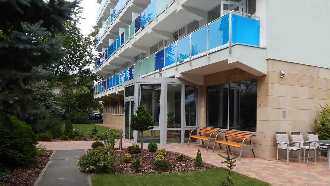 Nasz hotel znajduje się w centrum Hévíz, 100 metrów od jeziora i 50 metrów od przystanku autobusowego. 5 piętrowy budynek położony na kierunku wschód - zachód, z windą.