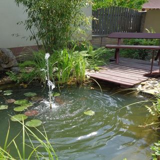 Podwórze przypominające park zapewnia naszym gościom spokojne otoczenie dla wypoczynku. Pośród krzaków i kwiatów znajduje się małe jezioro z kolorowymi rybkami.