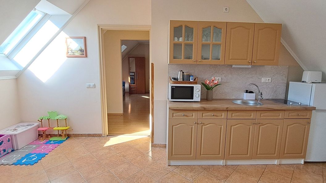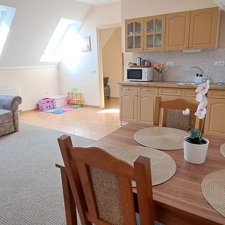 sierpień 2017Szép környezetben, viszonylag új építésű családi házban vannak az apartmanok. Mi a tetőtérben voltunk. Nagyon tágas szobák vannak, hatalmas nappalival ami a baráti társaságnak nagyon jó volt, szerintünk egy többgyerekes családnak se lenne bezártság érzése, kényelmes. Azonban legközelebb a földszinti, teraszkapcsolatos apartmant választanánk inkább.
