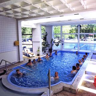 Hotel Hőforrás znajduje się w dzielnicy wypoczynkowej zaledwie na 500 metrów od miejskich basenów termalnych. Gorące termalne źródła o temperaturze 73 °C wybijają z głębokości 1100 metrów. Woda jest wybitnie bogata w sole mineralne, jod, brom i skutecznie leczy miedzy innymi przewlekłe choroby układu ruchowego.
