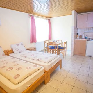 maj 2017obiekt przy basenach termalnych, w cenie noclegu wstęp na baseny gdzie w cenie są również sauny (parowa i suche). Mieszka się w dużych apartamentach wyposażonych w TV, łazienkę z WC, kuchenkę umeblowaną i wyposażoną (garnki, talerze, szkło itd. Codziennie uzupełniane są worki na śmieci, papier toalet.