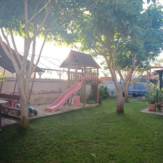 sierpień 2025Kertben csúszda, hinták, trambulin. Nagy nappali az emeleti apartmanban.