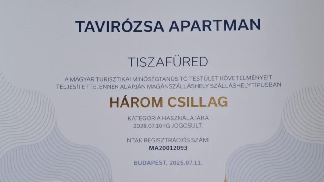 lipiec 2025Egy kiváló nyári emlékkel lettünk gazdagabbak a Tavirózsa Apartmanban .A szálláshelyen és a környéken tapasztalt csend, nyugalom, a természet hangjai önmagában pihentetőek. A szálláshely makulátlan tisztasága, a komfortosság, a tágas, ugyanakkor praktikusan és kényelmesen berendezett helyiségek maximálisan a vendégek kényelmét szolgálják. A szállásadók természetes, közvetlen, barátságos fogadtatása családias hangulatúvá varázsolta az ott töltött napokat. Nagyon köszönjük ezt a csodás nyári élményt! Szívesen jövünk máskor is!Éva és Zoltán
