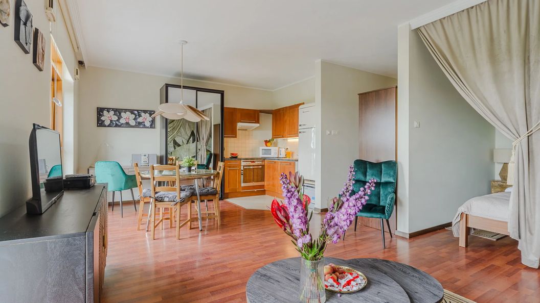 Przestronny apartament z aneksem sypialnym i aneksem kuchennym w nowym budynku. Apartament położony w znakomitej lokalizacji, w centrum Warszawy. Miejsce do spania dla dwóch par, są dwa dwuosobowe łóżka, szklany stół dla 4 osób, stały dostęp do Internetu, TV, telewizja kablowa. Apartament znajduje się w pobliżu największego w Europie centrum handlowo-rozrywkowego ARKADIA, w niedużej odległości Starego i Nowego Miasta. Nieopodal znajdują się przystanki komunikacji miejskiej, stacja metra Dworzec Gdański, można wiec swobodnie poruszać się komunikacją miejską pozostawiając samochód na naszym parkingu. Miejsce postojowe w garażu podziemnym dodatkowo płatne. \