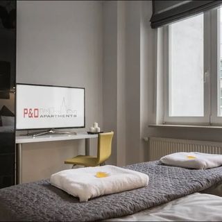Przestronny apartament w ciepłych kolorach, funkcjonalny pod każdym względem. Nowoczesne umeblowanie tworzy klimat, który spodoba się osobom ceniącym sobie przestronność, wysoki standard, doskonałą lokalizację jak i turystom lub grupie przyjaciół, chętnym poznać uroki Warszawy. Złożony z przestronnego salonu połączonego z kuchnią. W salonie duże, rozkładane, dwuosobowe łóżko, wysokiej jakości telewizor. Wyposażona kuchnia daje możliwość przygotowania posiłków. Dwie oddzielne, duże sypialnie posiadają łóżka, które można rozłączyć w efekcie czego do dyspozycji jest 5 oddzielnych łóżek lub 3 duże. Każda sypialnia wyposażona jest w oddzielny telewizor oraz szafę. Jedna z sypialni dodatkowo wyposażona jest w klimatyzację oraz balkon. Przestronna, w białych kolorach łazienka wyposażona jest w kabinę prysznicową.