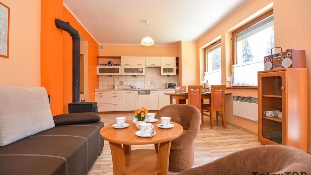 Apartament w swoich komfortowych wnętrzach może gościć jednocześnie 4 osoby. Przytulne mieszkanie składa się z: przestronnego salonu z klimatycznym kominkiem, nowoczesnym telewizorem oraz rozkładaną sofą, w pełni wyposażonego aneksu kuchennego połączonego z częścią jadalnianą, stylowej łazienki z kabiną prysznicową oraz eleganckiej sypialni z dużym podwójnym łóżkiem i balkonem. Dodatkowo do apartamentu przynależy taras, gdzie można zrelaksować się na wygodnych meblach ogrodowych podziwiając piękno podhalańskiej przyrody. Obiekt posiada dostęp do bezprzewodowej sieci Internet. Dla zmotoryzowanych Gości przed budynkiem przygotowano parking. Wypoczywający na czas pobytu mogą korzystać również z urokliwego ogrodu z altanką oraz placu zabaw dla dzieci.