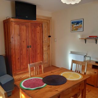 apartament 4 osobowy, pokój, kuchnia i łazienka. Dwa pojedyncze łóżka i jedno piętrowe. Wygodny dla dla rodziny 2+2.