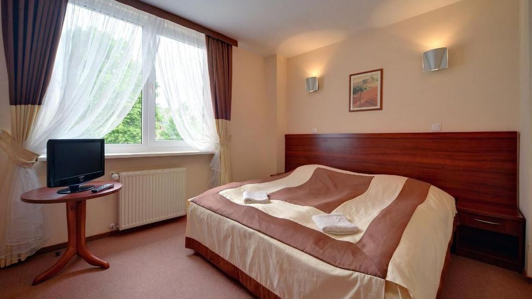 lipiec 2024Bardzo miła obsługa, i dobre jedzenie. Stan pokoju w stosunku do zdjęć i opisu, to dwie całkowicie różne rzeczy. Taraz w pokoju to pół metra parapetu. Zalane sufity w pomieszczeniu, brak wentylacji w łazience 45 cm przejścia pomiędzy łóżkiem a biurkiem. Opłata klimatyczna na stronie to 2.8 zł, w realu 3.6 zł
