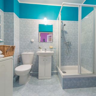 łazienka: brodzik z prysznicem, umywalka, wc, pralka