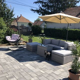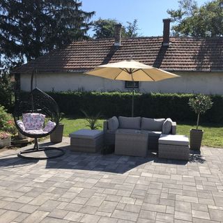 sok kerti játék a kisgyerekek számára könnyen megközelíthető Mi a 6 ágyas „apartmant” vettük ki. Azért idézőjelesen, mert a mi részünk a másik apartman konyháján keresztül közelíthető meg. Nekünk volt külön fürdőnk és konyhánk, bár a konyhában nem volt hűtőnk, és a gázhoz sem volt palack, így nem tudtuk használni. A fa ágyak jónak mondhatóak, viszont a kanapén Én biztosan nem aludtam volna jól, szerencse, hogy nem sokan voltunk. A párnák szerintem nagyon rossz minőségűek, ami szintén a pihenést befolyásolja. Hasonlóan a törölközők is. Kint mind nappal, mind éjszaka kellemes csend van, a környék biztonságosnak tűnik. Az udvar a képekhez eléggé hasonlít, bár a szürke kerti pihenő nincs árnyékolva. A grillezős - étkező asztalos részt pedig alapos portörlés után tudtuk volna használni. Nappal nagyon sok a darázs, este pedig a szúnyog… nem tudom, ez ellen lehetne-e tenni valamit.. A gyerkőccel jót tudtunk játszani a sok kinti játéknak köszönhetően (hinta, trambulin, focikapu, kosárpalánk) A tisztaságot közepesnek ítélem meg, azért láttunk mi is pókokat, de minket ez nem zavart. A szobák kellemesen hűvösek voltak a 28-30-fokos kinti melegben is, nem hiányoltunk klímát. Szúnyogháló biztosította a nyugodt alvást és elektromos redőny is volt. A szállásadónk kedves vendéglátó volt, és nagyon segítőkész. Reméljük, hogy a visszajelzésünk segítség a többi megszálló vendégnek és hasznára válik szállásadónknak is. Köszönjük a vendéglátást!