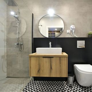Łazienka: prysznic z deszczownicą, wc, umywalka, szafki, pralka, radio