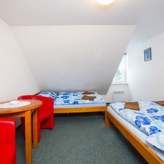 Spokojenost byla i s dostatečným množstvím teplé vody pro koupání po výletech ve sprchovém koutě. 1.Šestilůžkový pokoj s pouze 6 postelemi a jenom jedním křesílkem a malým stolkem. 2.Na začátku pobytu jsme museli požádat o pročištění WC které odtékalo velmi pomalu. 3.Okna pokoje byla směřována nad vchodem a částečně nad letní terasou. Zde je zvykem pro hosty pouštět rádio Frekvence 1 , ale když toto rádio hrálo až do 1 hodiny ranní bylo to velmi nepříjemné. Stačilo by rádio vypínat v obligátních 10 hodin večer , aby se dalo větrat a přitom v klidu spát . 4.Kulturní místnost s kulečníkem , stolním fotbálkem a el. šipkami mezi dvěma pokoji je zvrhlost . Hosti zde řádí dlouho do noci a přes sádrokartonovou stěnu je vše slyšet . Stačilo by nastolit pevný řád a ukončit zábavu v 10 hodin večer a dodržovat noční klid. Nebo přestěhovat tuto zábavnou místnost někam do úrovně baru , tj. do suterénu.