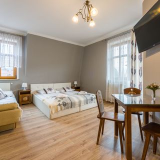Niesamowicie głośno-budynek przy samej ulicy. W środku smród straszny kurz w recepcji i korytarzach. Pokój miał być z łazienką A okazało się że faktycznie łazienka jest, ale trzeba do niej iść przez hol. To było bardzo niewygodne zwłaszcza że za każdym razem kiedy dziecko chce do toalety trzeba się ubierać brać klucze i wychodzić z pokoju-bardzo nie w porządku był fakt że w opisie pokoju nie było takiej informacji- pokój miał mieć lazienke. Nie zarezerwuje więcej noclegu przez Państwa stronę. Miałam dostać 30zl zwrotu za cała płatność z góry A nie dostałam nic. W opisie napisane było że recepcja działa przez całą dobę A przez 4 dni nie widzieliśmy tam nikogo. Jedynie właściciela na 10 min przed odjazdem.