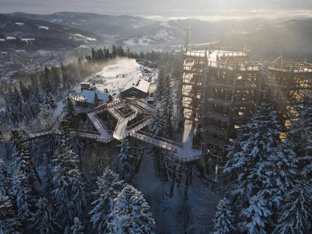 fot. Wieża widokowa w Krynicy-Zdroju / źródło: materiały prasowe - Ośrodek Skolnity w Wiśle - Beskidzkie Centrum Narciarstwa im. Adama Małysza w Wiśle – obowiązkowy punkt dla miłośników sportów zimowych. Niedawno pisaliśmy o otwarciu wieży widokowej w Wiśle, a już niebawem w tym urokliwym mieście powstanie kolejna atrakcja. Tym razem mowa o Beskidzkim Centrum Narciarstwa im. Adama Małysza. Obiekt ma być nowoczesną przestrzenią wystawienniczą z trofeami najwybitniejszych polskich skoczków narciarskich. Wystawa powstanie przy wsparciu New Amsterdam i skupi się na dwóch głównych motywach – regionie i mieście Wisła oraz postaci Adama Małysza będącego jednocześnie jednym z pomysłodawców i głównych bohaterów wystawy. Nie zabraknie również okazji do przybliżenia sylwetek innych sportowców, np. Jana Raszki, Jana Szturca, Piotra Fijasa, Stefana Huli czy Piotra Żyły, a także obejrzenia wyjątkowych eksponatów. Prawdopodobny termin otwarcia Beskidzkiego Centrum Narciarstwa im. Adama Małysza to maj 2026 roku. Z wizytą w Wiśle nie ma jednak co zwlekać. Jeśli już teraz planujecie wypoczynek w górach, sprawdźcie oferty noclegów w Wiśle na każdą kieszeń.