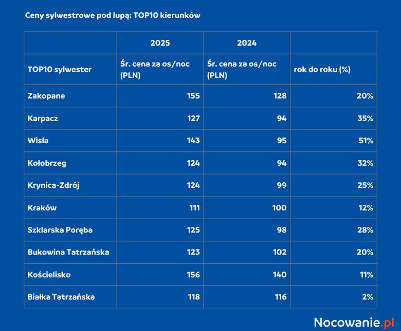 Dane Nocowanie.pl pokazują, że Polacy coraz częściej spędzają sylwestra w popularnych kurortach i miastach turystycznych. Średnie ceny za osobę za noc w poplarnych miejscowościach wahają się od ok. 111 zł do 155 zł. Najdroższe noclegi dostępne są w Zakopanem (155 zł) i Kościelisku (156 zł), a najtańsze w Krakowie (111 zł) i Białce Tatrzańskiej (118 zł).